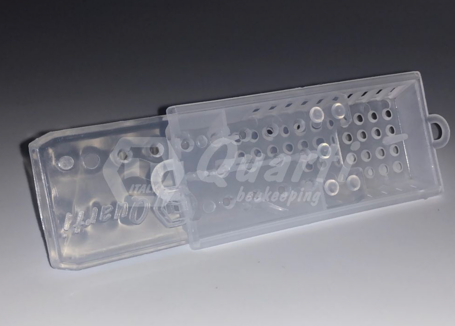 This Quarti double exit queen bee cage is a practical tool for transporting, introducing, or temporarily housing queen bees during queen rearing programmes. Made from semi-transparent plastic, the cage allows both the queen and attendant bees to be contained securely while enabling easy access for handling and inspection.