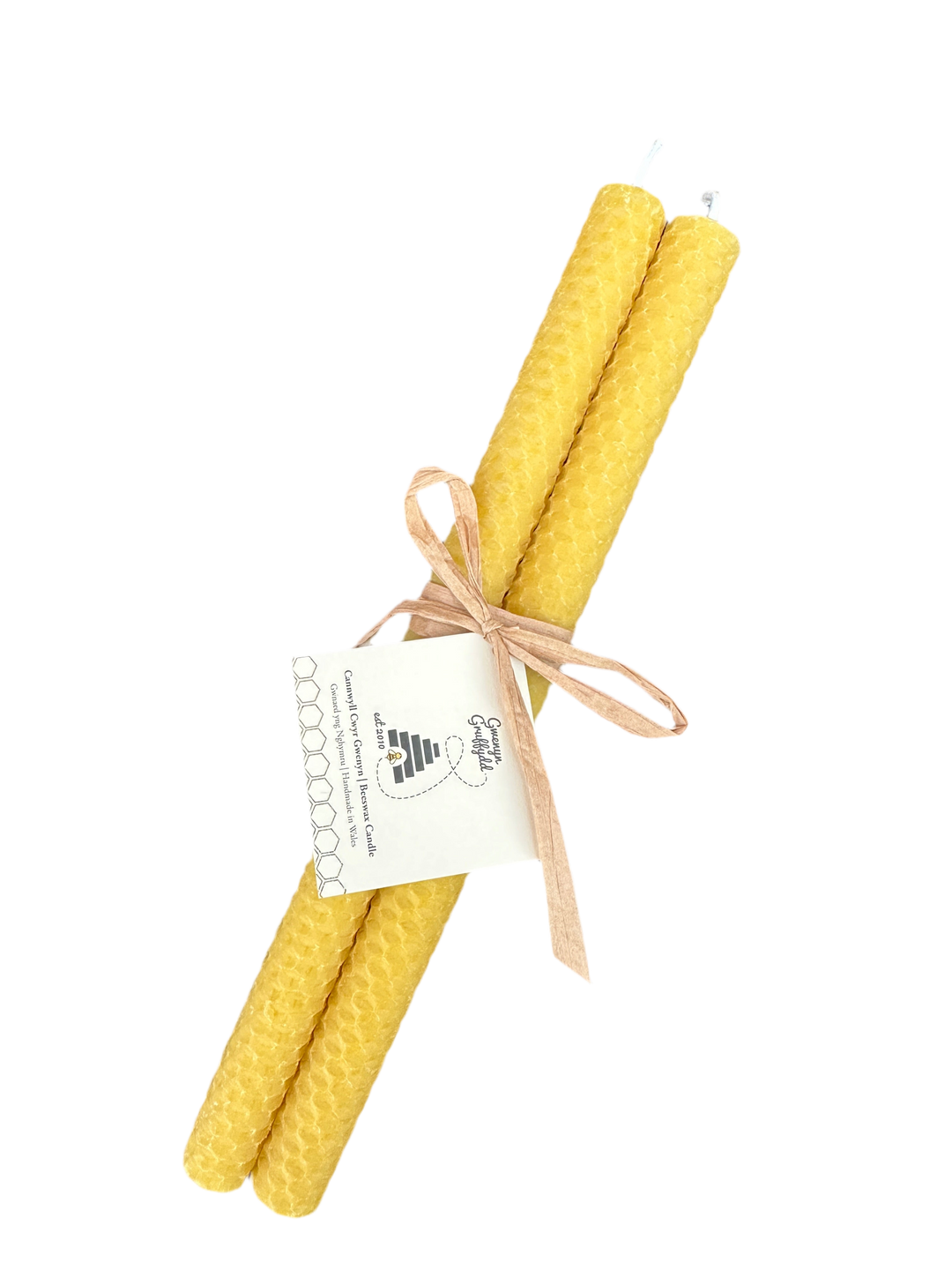 These hand crafted pure Beeswax candles are made by hand on our rural West Wales Honey Farm. Beeswax is the by-product from honey production and the wax cappings are turned into beautiful yellow wax for candle making. The colour of the beeswax will vary from batch-to-batch, from season to season - they are naturally coloured.